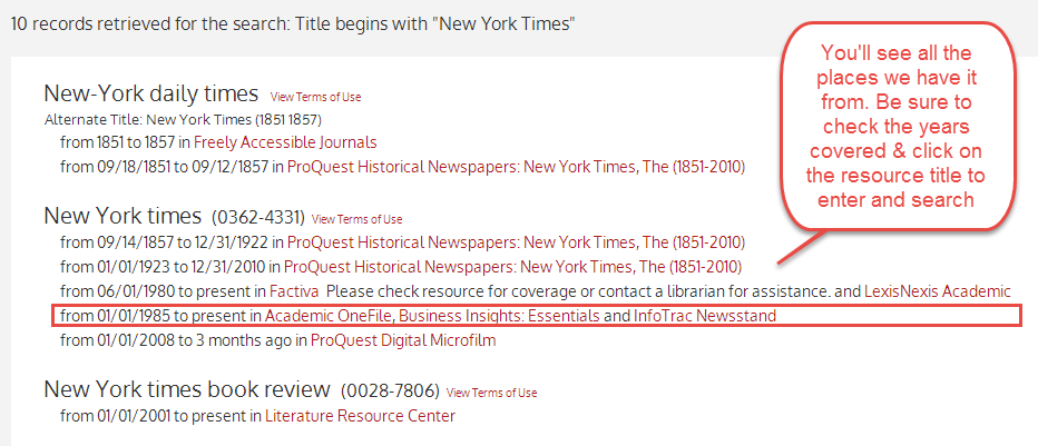 Once you've searched or browsed for an ejournal, you'll see all the databases or resources it's available from that Cornell has access to (we often get different years of coverage from different places). Make sure to check the years you need and click on the title of the appropriate resource to enter and start searching for articles!